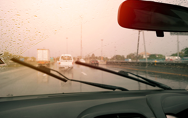 Para-brisa visto de dentro do carro, com limpador em movimento irregular sob chuva.